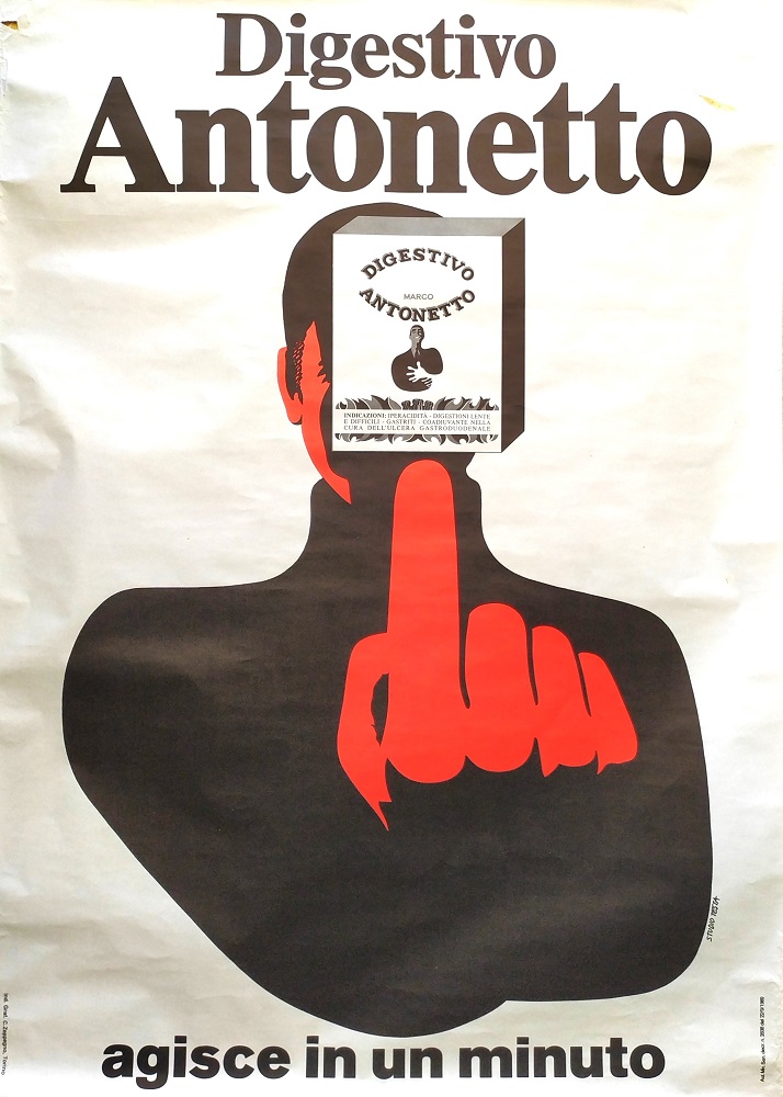 Rara versione riveduta del celebre manifesto creato da Armando Testa a inizio anni ’60. Precede la successiva revisione con i volti adattati alla moda degli anni Settanta.