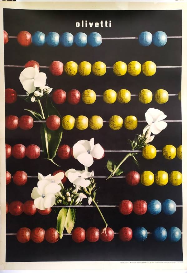 Rare poster, among the highly known of the Olivetti’s history. It’s also known as “Olivetti’s abacus”.